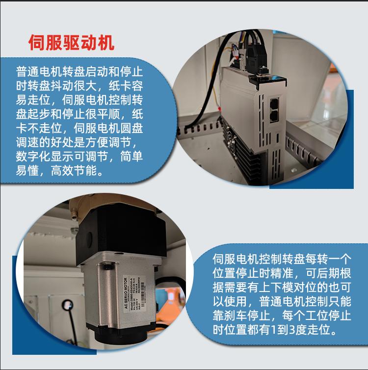 ②伺服電機控制轉盤,模具邊上可以放一疊紙卡,方便工人能快速放進模具,大大提高生產效率。普通電機控制的轉盤,模具邊如果放紙卡就會把紙卡沖走轉位。