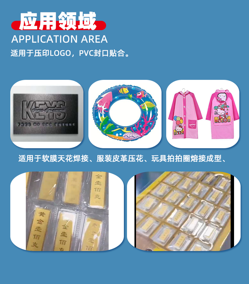 金條包裝雙頭高周波機符合歐洲第4代環保標準,主要用于各種LOGO壓印,PVC袋子封口,環保材料封口切邊,以及測血壓袋,血袋,尿袋,引流袋等等醫療袋子封口切邊。
